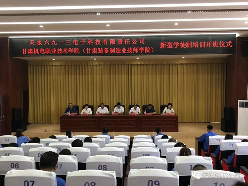 7410026月30日下午,由天水六九一三電子科技有限責任公司和甘肅機電職業(yè)技術(shù)學(xué)院聯(lián)合舉辦的“企業(yè)新型學(xué)徒制培訓”開(kāi)班儀式在甘肅機電學(xué)院六樓會(huì )議室隆重舉行。天水市人力資源和社會(huì )保障局副局長(cháng)劉宇,甘肅機電職業(yè)技術(shù)學(xué)院黨委副書(shū)記、院長(cháng)趙彥軍,甘肅機電職業(yè)技術(shù)學(xué)院黨委委員、副院長(cháng)毛文輝,天水市人力資源和社會(huì )保障局職業(yè)能力建設科科長(cháng)胡博及公司領(lǐng)導、機電學(xué)院相關(guān)領(lǐng)導、老師、學(xué)員共計50多人參加了開(kāi)班儀式。